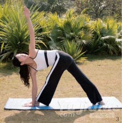 3、呼氣,上身下傾,向左旋轉,右掌放在左腳外側,左臂向上伸展;轉頭,眼看左手;姿勢保持數秒,自然呼吸;吸氣,還原步驟2姿勢,做另一側動作,反覆練習。