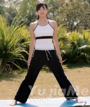 2、吸氣,雙腳分開約為兩個肩寬;上身保持挺立狀態,脊椎向上延伸。