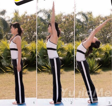 站立時,身體不要前傾保持整個身體在一條直線上,盡量向上伸展;盡可能向兩側伸展。練習的時間應一樣長。