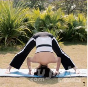 3、呼氣,低頭彎腰,上身前傾,直到頭頂著地;雙手撐在地上,雙腿、脊背都保持筆直。