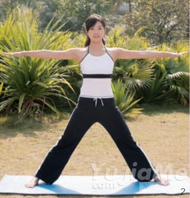 2、吸氣,雙腳分開約為兩個肩寬,雙臂側平舉,將雙手延伸至最遠;上身軀幹書保持挺立狀態。