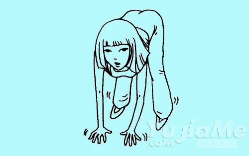 你所要做的,就是彎下腰,雙手觸地,像動物一樣地行走。現在,很多家庭都用木地板或者複合地板裝修,衛生是有保證的。即便是地磚,也沒有關係,戴上手套就可以。你也可以想像著你是某種動物,模仿其姿勢來完成這個練習。