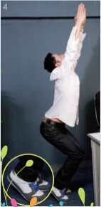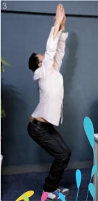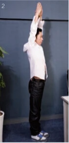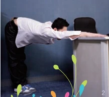 2、吸氣,伸直雙臂舉過頭頂;呼氣,以腰R為軸,自腰推至頸推一節節下壓,直到身體平行於地面,雙手放在桌上。保持姿勢5一10秒,吸氣,還原站姿,反覆練習。