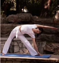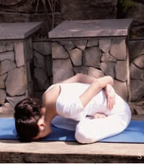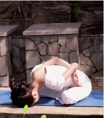 3、呼氣,上身慢慢向前俯身,頸部放鬆,額頭觸地;雙手在背後保持交叉狀態;臀部不可離地。