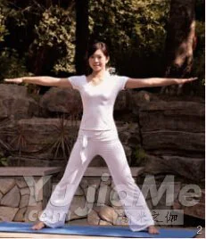 2、吸氣,左腳向外橫跨一步,雙腳盡量分開;雙臂側平舉,全身呈大字。