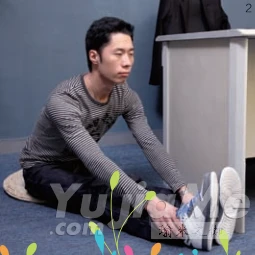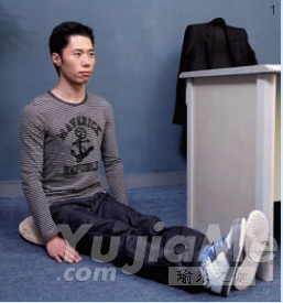 1、坐在地上,雙腿向前伸直,雙腳併攏,坐穩;頭部、頸部、脊推保持直立,雙手放在身體兩側地板上,吸氣。
