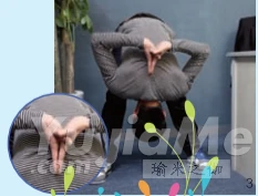 3、呼氣,低頭彎腰,雙手在背後合十,大拇指相扣,指尖指向頭部;深呼吸,保持5一10秒,吸氣時還原站姿,反覆練習。