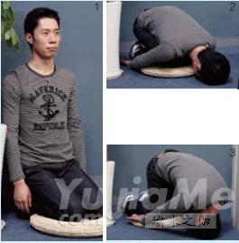 1、跪坐,臀邵放在雙腳腳後跟上,雙手自然放於小腿外側;挺直腰背,抬頭挺胸,吸氣。