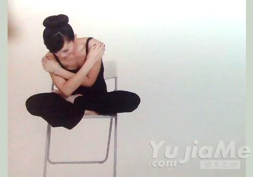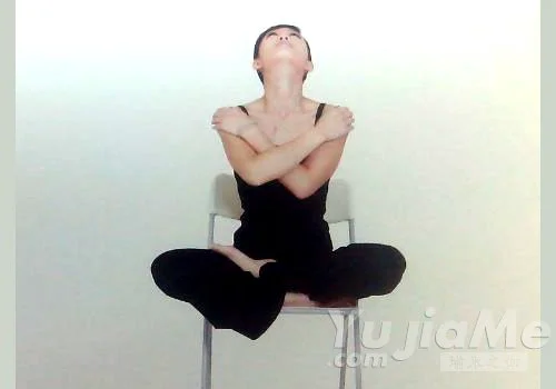 4、雙腿交叉盤坐在椅子上,雙手放在膝蓋上。