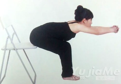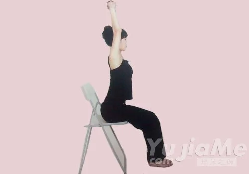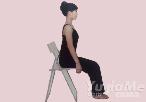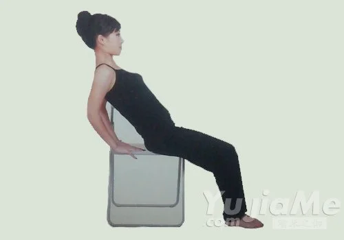 6、側坐於椅子2/3處,雙腿放鬆,腳跟併攏,上身挺直,肩膀放鬆。吸氣,雙肘彎曲,手掌緊貼於臀部後側,維持10秒。