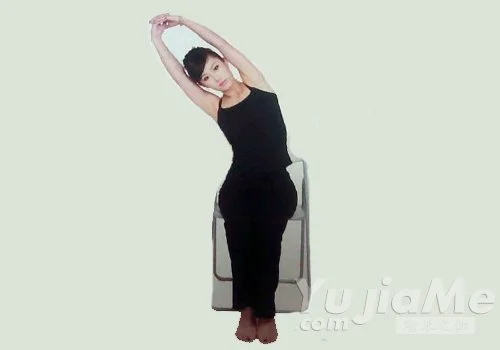 2、吸氣,收腹,雙手高舉過頭頂,十指交握,手臂伸直盡量向上延伸。