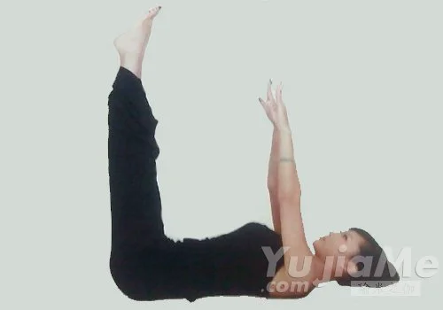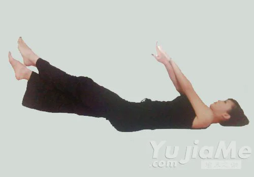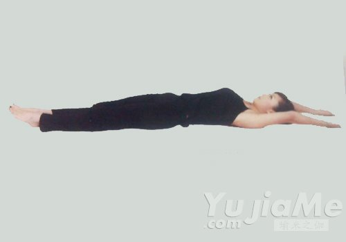 1、仰臥、平躺在地上,雙腿併攏伸直,雙臂沿耳朵上舉,兩手掌向天花板。