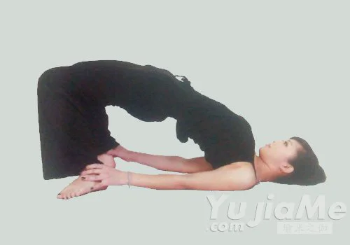 12、仰臥,抓住腳踝,彎曲腰背呈半輪狀,肩膀和頭部與地面保持貼近,保持10次呼吸。