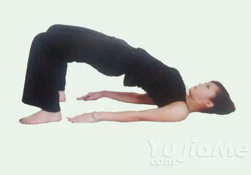 4、躺在地面上,膝蓋彎曲,雙腳平行放在地面,身體向上拱,雙手放在身體兩側。