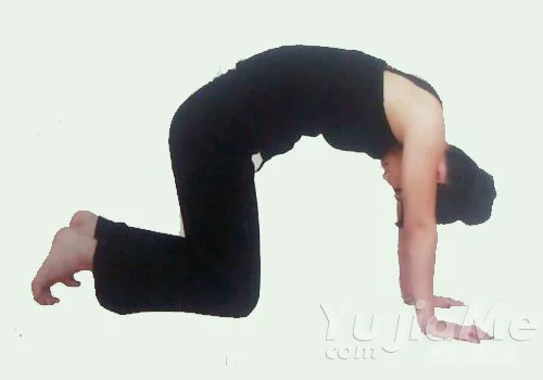 3、雙手和膝蓋接觸地面,吸氣時,脊柱盡量向上拱,呼氣時,脊柱盡量向下沉。