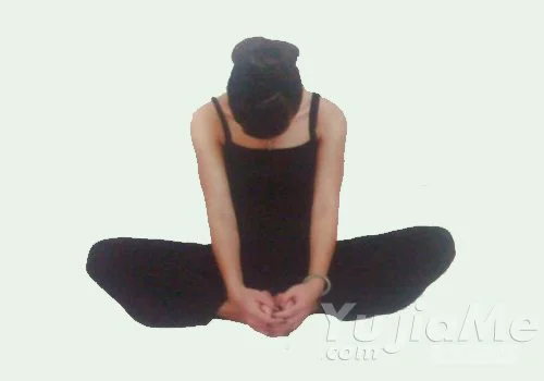 7、坐姿,彎曲膝蓋,雙腳腳心相對,雙手握住雙腳,腿部接觸地面。保持5次呼吸。