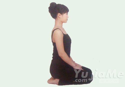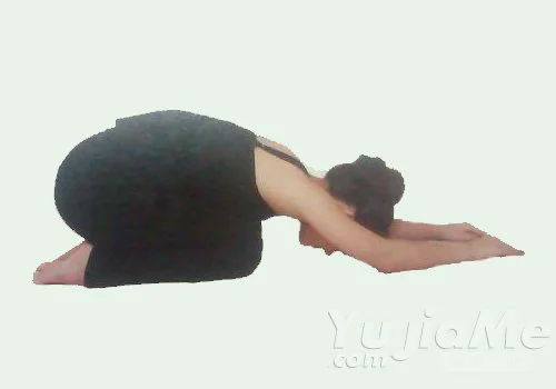 1、雙腳併攏,屈膝坐在腳後跟上,膝蓋分開,雙腳大腳趾相抵。手臂向前伸展,頭部自然貼近地面,做5次自然呼吸。如果感覺吃力,可以在額頭下放置椅墊。臀部向後伸展,胸部向前伸展,肩膀遠離耳朵。