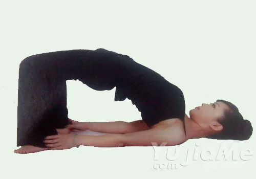 3、仰臥,雙腳分開,與臀部同寬,雙腳間可綁一根帶子,屈膝,雙手抓住同側腳踝,雙腳同時用力撐地,骨盆借勢向上提起,肩膀向兩側擴展,肩膀兩側撐在墊子上,上背部提起,放鬆頸部,打開胸腔。