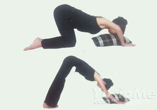 6、跪姿,手和膝蓋接觸地面,胸部下方放置椅墊,腿逐漸伸直使身體進入下犬式,使前額接觸椅墊,頸部保持放鬆。如果感覺吃力,可適量增加椅墊的厚度,或用椅墊包裹枕頭。手臂、上背部挺直,用力向上提起,上身與雙腿呈90度。頸部、喉嚨和臉部保持放鬆,堅持1分鐘。