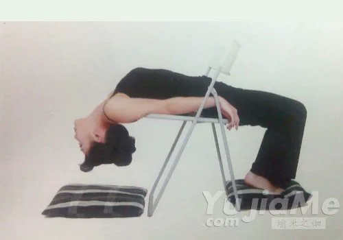 4、自然站立,雙腳分開,稍寬於臀部,腳前放置椅墊,下腰,頭部頂在椅墊上,初練若感覺吃力可增加椅墊的厚度或用其他物品代替,雙手抓住同側腳踝,雙肘分開,使身體重心集中在雙腳上。全身保持放鬆,堅持1分鐘。可以感覺到頸部慢慢拉成,胸部逐漸擴展。