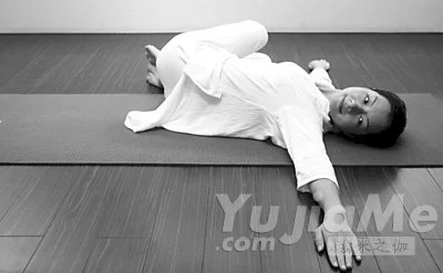 做法:仰臥在地面上,手臂與肩齊平打開。彎曲雙腿,雙膝併攏在胸前,隨呼氣向右側扭轉,隨吸氣回到中間。再呼氣扭轉向左側,重複多次。