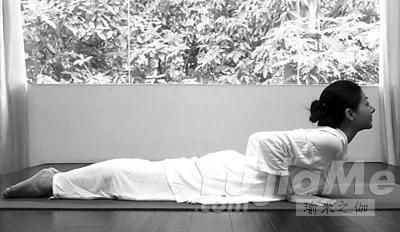 做法:俯臥在地面,雙手支撐在胸廓兩側,雙腿向後伸展。頭和胸部向前向上抬起,肚臍放在地面上,保持五個呼吸,重複三次。
