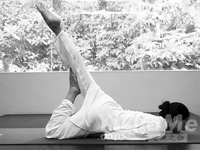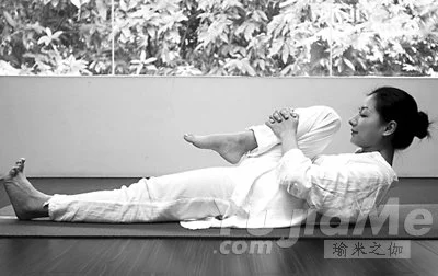 做法:仰臥在地面上,彎曲右腿,兩手十指交叉,抱住小腿。下頜或額頭接觸膝蓋。保持五個呼吸,交換做另一側。