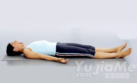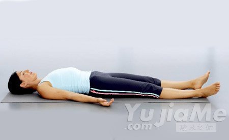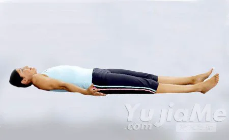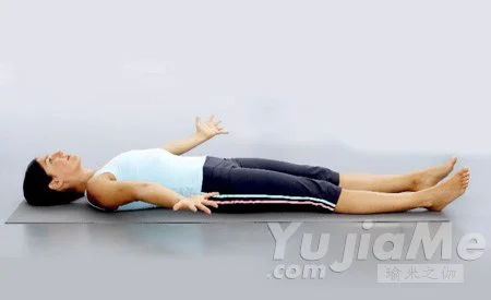 1、仰臥,雙腳分開一小段距離,腳趾朝向外側,雙臂自然置於身體兩側的地板上,身體平躺,自然呼吸,或可做幾個深呼吸。