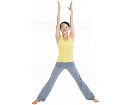 吸氣,雙臂抬高至頭頂,手臂伸直,手心相對,脊柱向上伸展。