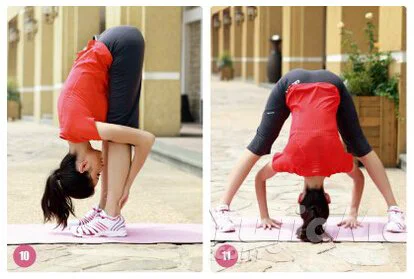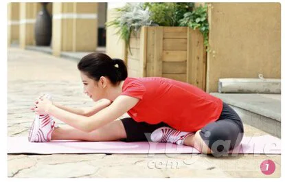 雙腳分開,下腰,雙手盡量去握雙腳的腳踝,讓自己的頭頂去找腳尖。腿伸直肩頸拉長。