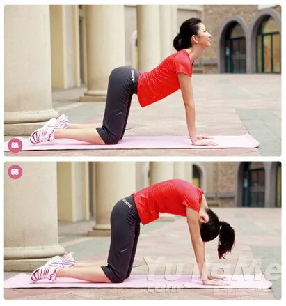 俯臥,雙手雙腳與肩同寬,吸氣時腰部下沉,臀部頭部向上,呼氣時背部向上,臀部頸部收回。手臂一直伸直,注意呼吸的配合。
