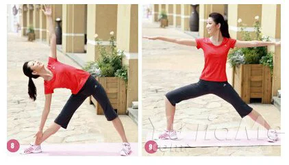 站立,雙腳分開與肩同寬,雙手側平舉,然後彎腰,眼看上方指尖。反側同樣。膝蓋伸直的同時保證重心上提。