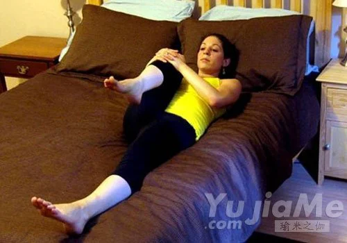 仰臥於床上,伸直雙腿,彎曲膝蓋移動至胸前,盡量靠近胸部,雙手環抱住小腿,輕柔使力,使大腿更加靠近胸部。注意放鬆脖子和肩膀。保持均勻呼吸30秒。另一邊如法炮製。