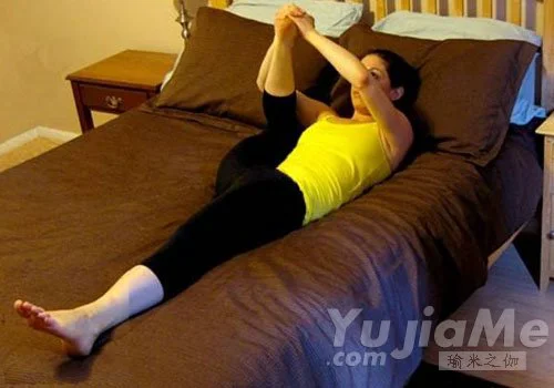 仰臥於床上,伸直雙腿;緩慢彎曲右膝,腳掌朝向天花板,用雙手握住右腳掌,注意大腿緊靠身體,後背和肩膀放鬆不要借力,保持均勻呼吸30秒。另一邊如法炮製。