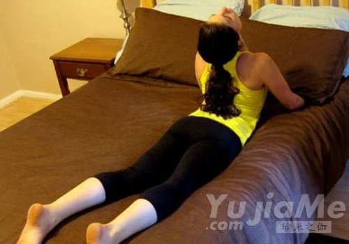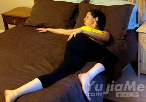 平躺在床邊,下半身保持右側臥,抬起右腿,盡可能使右膝蓋靠近胸部;翻轉上半身,伸開右手臂帶動上半身以及頭部,向床的邊緣延伸。注意不要高低肩,保持肩部處於同一水平線,在這一狀態維持30秒,保持均勻呼吸。另一邊如法炮製。