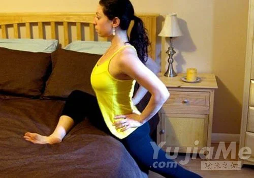 站在床前,將右腳放在床上,左腳盡可能向後伸直。根據自己的韌帶,逐漸移動右膝蓋觸及床面,在極限處停留30秒。另一邊如法炮製。