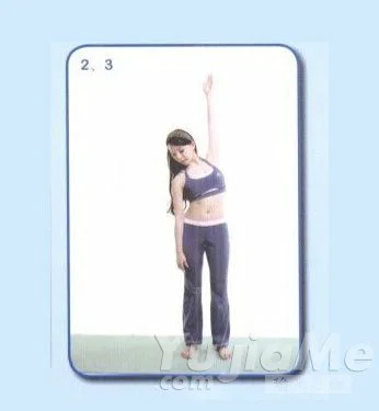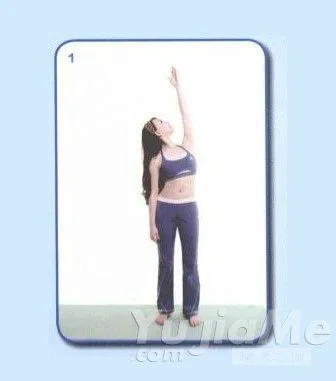 1、吸氣,左手向上延伸,肩膀放鬆。