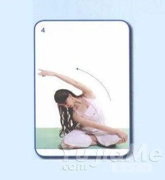 4、吐氣,將身體慢慢倒向右側,左手放鬆掛在頭頂上,停留一個深呼吸。