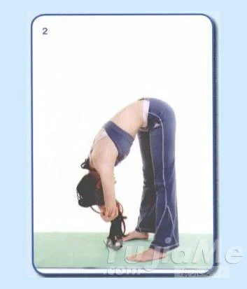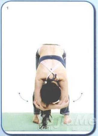 1、吐氣,身體放鬆自然向前垂下。保持身體前彎放鬆的姿勢,放開雙手,左右輕輕搖晃,放鬆脊椎。