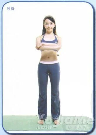預備姿勢:站姿,雙腳打開與肩同寬,縮腹、頭頂向上延升。
