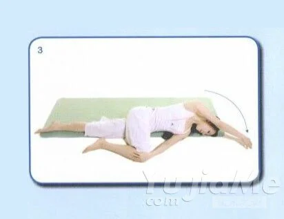 2、左手扶住膝蓋,倒向左側,頭轉向右側,右手臂打開,注意此時兩邊肩膀都要呈著地狀態。