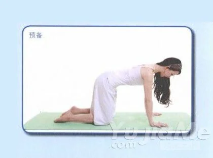 預備姿勢:四足跪姿,雙手掌在肩膀正下方,膝蓋在骨盆正下方,雙腳與肩同寬,吸氣,感覺頭頂和尾椎延伸拉長。