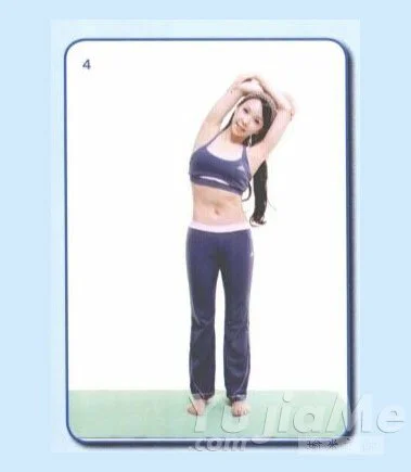 3、吐氣,雙手肘互繞在頭頂,向右伸展,感覺身體左側延伸,吸氣回到中間。