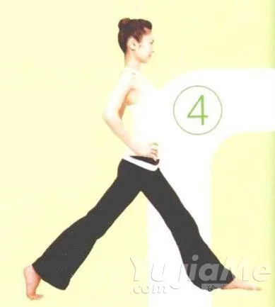 ③ 向前伸出左腳,兩腳前後分開,距離盡量大一些。右腳腳尖著地。骨盆朝向正前方。
