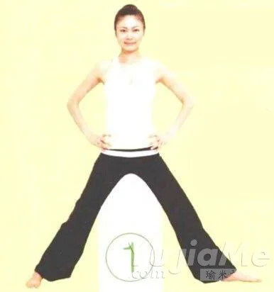 ① 兩腳分開,距離為肩寬的2倍。左腳腳尖向正側面,右腳腳心盡量處在左腳腳尖和腳踝所在直線的延長線上。