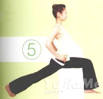 ⑤ 呼氣的同時左腳向前跨出。右腳保持提臀伸展膝蓋的姿勢。