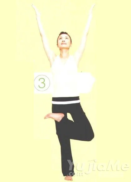 ③ 掌握平衡後,雙手慢慢打開,腳部抬高,深呼吸3次。呼氣的同時還原到動作①。