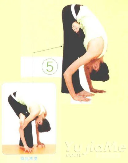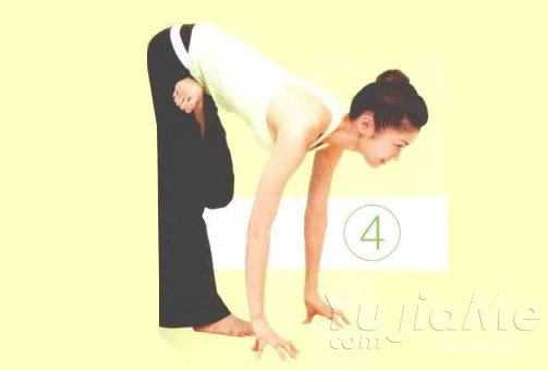 ⑤ 呼氣的同時加大前屈幅度,頭頂向下。掌握平衡的同時深呼吸3次。還原到動作①,反方向相同。難以做此動作的人可以彎曲膝盆蓋,兩手著地。