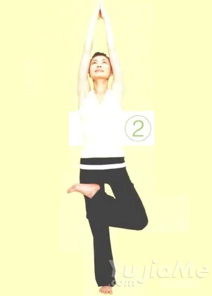 ① 做山式姿勢,重心轉移到右腳,左腳的外腳踝貼緊右腳跟部(樹式)。雙手在胸前合掌。