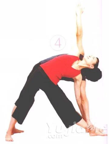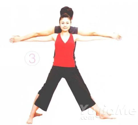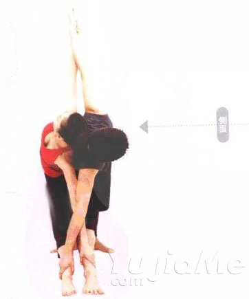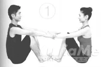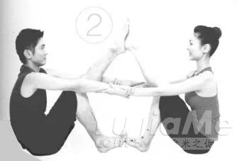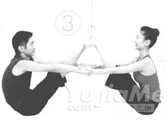 ③ 配合著呼吸頻率,在相互尊重的基礎上慢慢地抬起左腳,呈V字形,並保持平衡。如果有能力,還可以嘗試將兩腿放乾雙手外側。